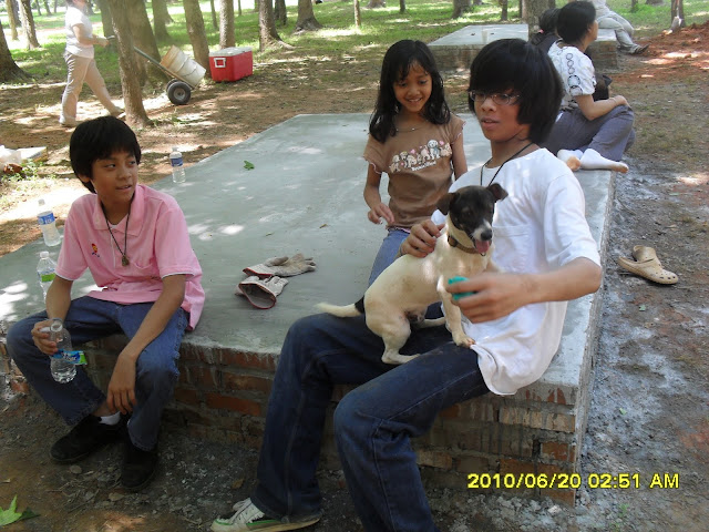 My daughter turning her face away from the camera again when I taking a picture, my son in a white shirt and another son in a pink shirt, that's my little girl on the right hand side helping too :), and that lady she and her son helping a lot for the temple, she even hiring her 18 years old son on his day off to come help the monk build the bench at the temple.